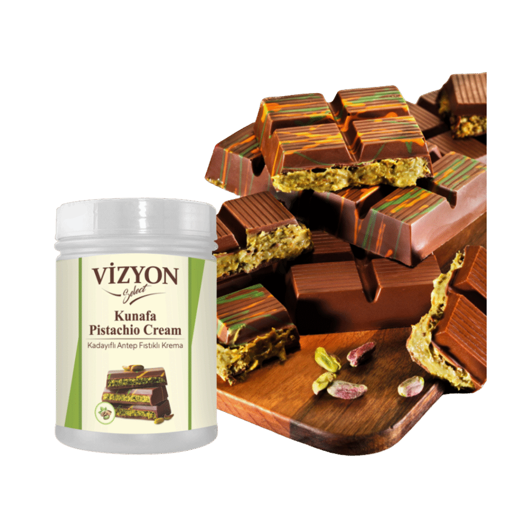 El relleno de pistacho Kunafa combina la textura  crujiente de la kunafa con el sabor intenso y característico del pistacho, ofreciendo una crema versátil que aporta profundidad de sabor y riqueza textural a una amplia variedad de preparaciones.